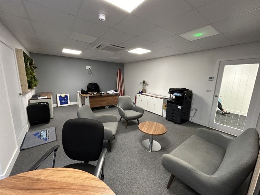 Recently built, mid-terraced business unit with fully fitted mezzanine offices in Eurotech Park. Located in a prominent position within the development the hybrid unit has been designed to provide workshop and modern offices. The unit is built with modern composite insulted panels set under a curved roof with a solar array fitted. Externally, the unit has four parking spaces plus loading area. There is shared cycle parking on-site and access to outdoor rest and picnic areas. Permitted use is B2 & B8 – unsuitable for uses connected with motor trade. EPC: B(44)