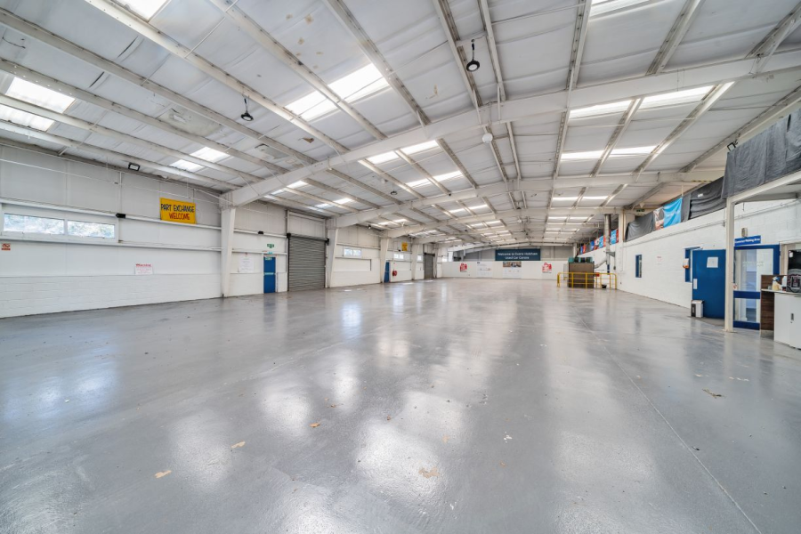The prominent position of this corner site provides a strong presence for any business. The principal building is a widespan steel portal frame construction with dual pitched roof providing daylight panels. The warehouse has a min eaves height of 4.10m rising to 5.24m. LED lighting is provided throughout. To the eastern elevation, roller shutters have been replaced with glass fronted openings. To the south, three roller shutters provide access to the warehouse. To the western elevation, the building has been subdivided and provides further roller shutters accessed from a gated compound. There is an area of offices (with welfare) fronting Marshall Road, with glazed windows, and a mezzanine with low eave which provides additional storage.